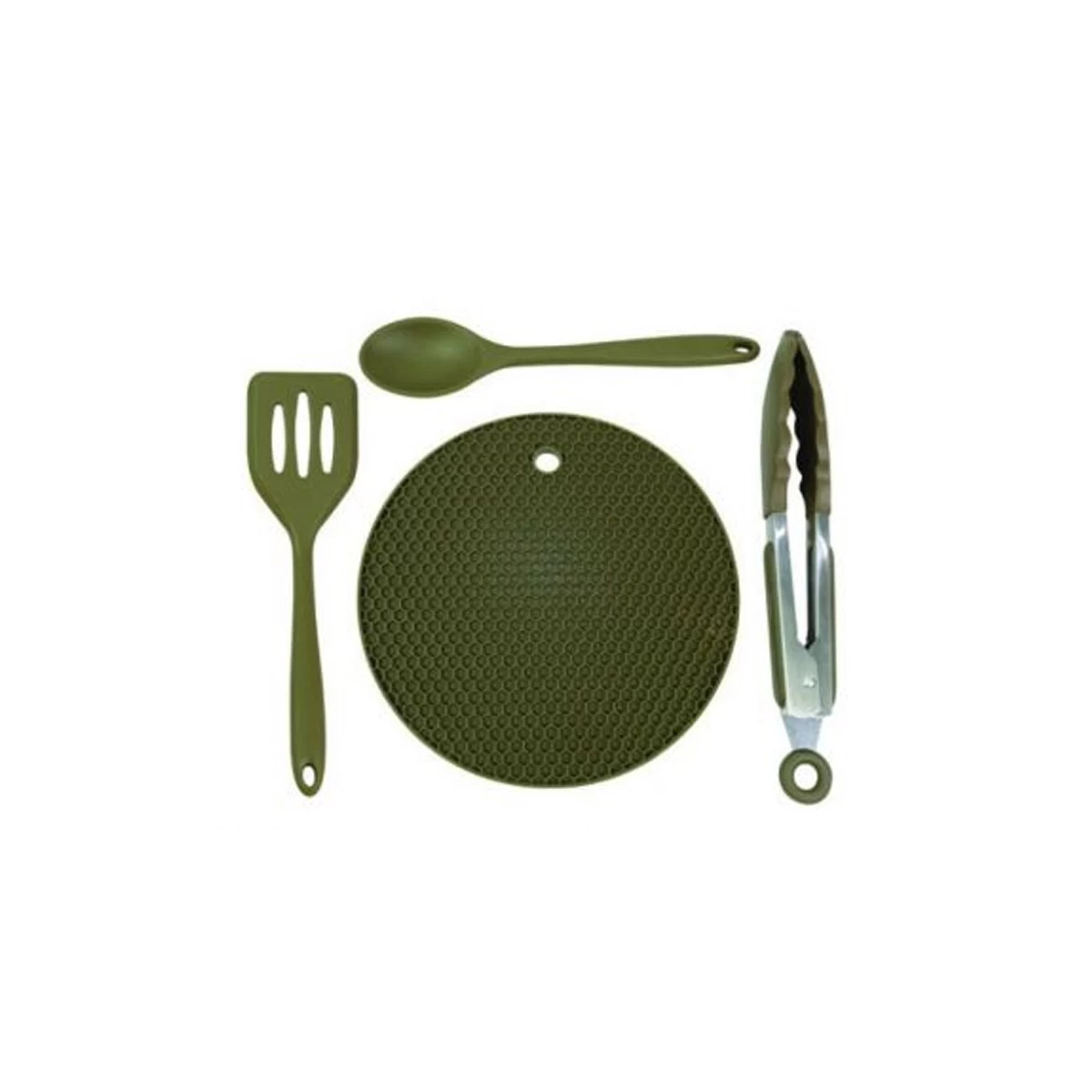 Deze 4 delige Silecone opschepleper en tangen set wordt geleverd met een lepel, een spatel , een tang en een pannen onderzetter.