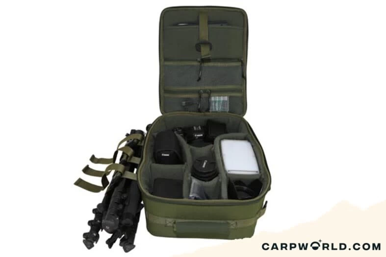 Bescherm uw dure DSLR-camera en accessoires met deze speciale tas. Het hoofdcompartiment biedt voldoende ruimte voor grote camerabehuizingen en lenzen. Door middel van de gevoerde scheidingswanden kan men reserve lenzen, flitsers en andere speciale accessoires makkelijk zelf indelen en opbergen. De bovenzijde heeft een groot vak voor een tablet en een extra vak met ritsen voor extra geheugenkaarten, batterijen en kabels. Met drie volledig verstelbare en afneembare riemen kunt u uw statief eraan bevestigen en hierdoor een complete opslag creëren voor elke visser met een passie voor fotografie.